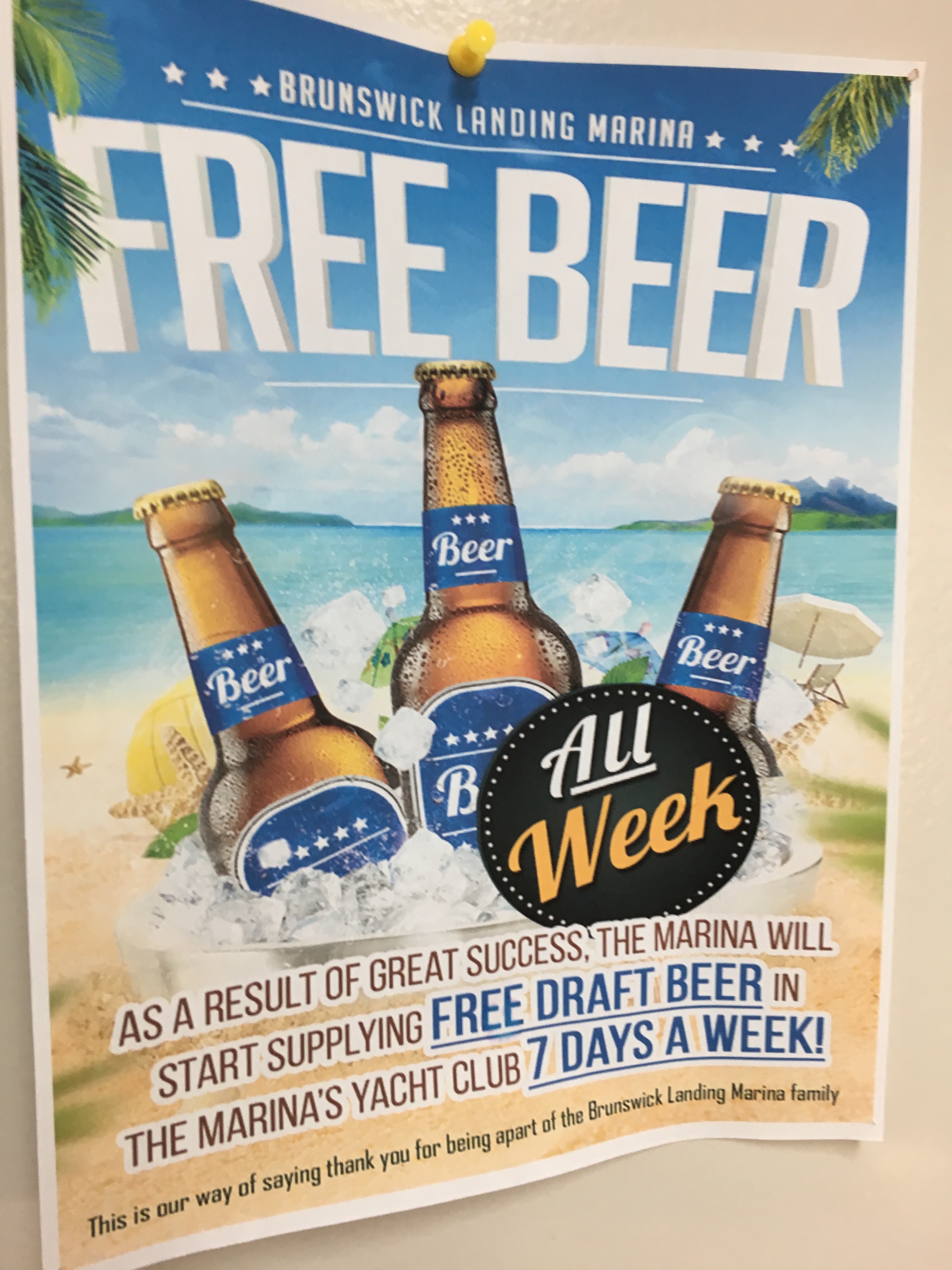 We left NY  just as the chill arrived in late October.  We drove to Genevieve in Georgia overnight and started the exhausting process of putting her back in order: scrubbing the bird poop off; washing, waxing and polishing every single inch of gelcoat and stainless; bending the sails back on; engine maintenance..the list goes on and on.  But at least it was warm, there was free beer at the marina lounge, and we had wifi…kinda.img_0262