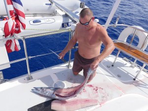 So you wonder, what do we do all day? Well having guests kept us busy showing the folks the sights. Between visitors we slowed the pace a bit (!) and sought out lovely places and sometimes stayed put for a couple of days. We did our boat maintenance chores (not an insignificant amount of time), read, swam, snorkeled, hiked. We watched the entirety of The Wire and reprised Downton Abbey from series one. Of late we have put some effort into going out to the drop off where the depth goes from 150 ft to 2000 ft in an instant. This is where the big fish hang. But we have had only mild success as the days it’s most appealing for us to go out to the depths to hunt, i.e. sunny and calmish, is just the conditions that fish don’t like. They prefer overcast and roughish to do their prowling. But we are determined that the mother lode of wonderful fishing lures that LeeAnn and Murney brought us will not go to waste. We have had more success with lobster hunting, some really big crustacea have caught the end of our Hawaiian slings and have ended up on the grill or in lobster linguini.