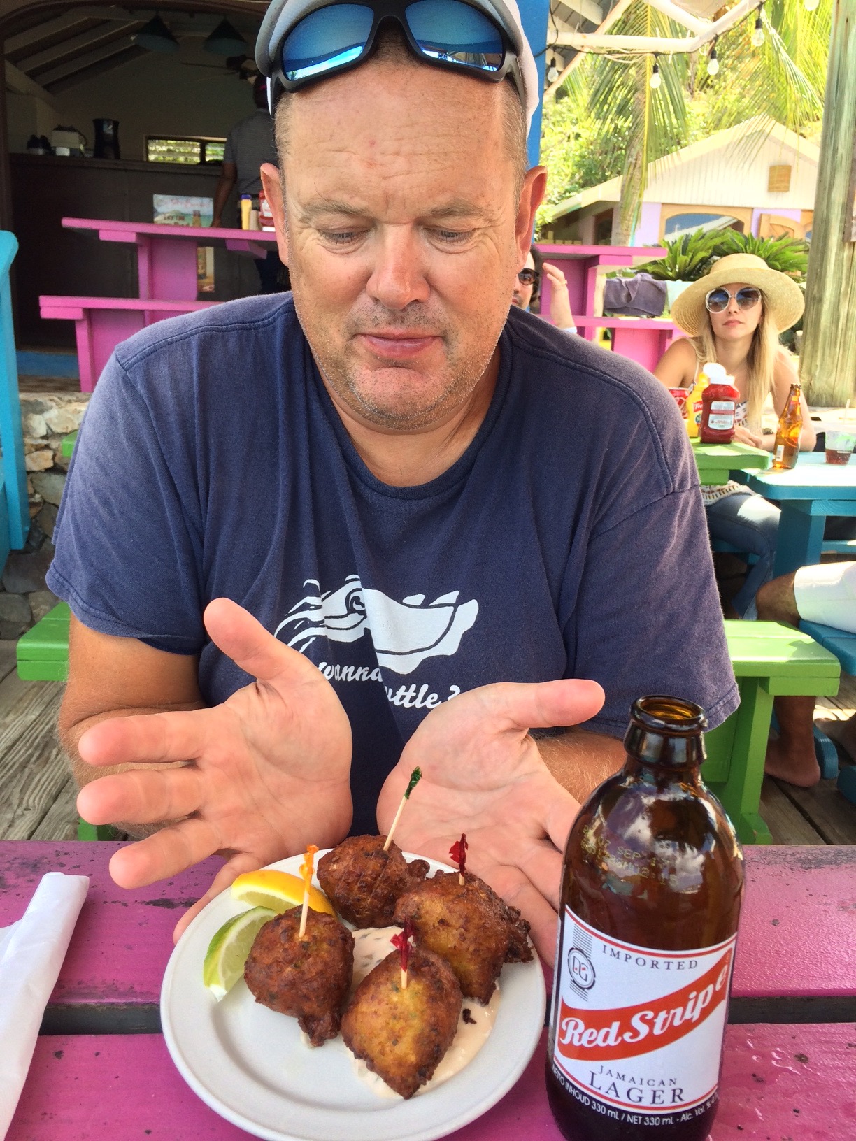 Between the well-trodden highlights we discovered some great peaceful anchorages; lovely bays with no mooring buoys and therefore few charter boats (see below!). Our fave’s were Benure’s Bay on Norman Island, Booty Bay on Salt, Prickly Pear in North Sound, Maho and Cinnamon Bays on St John, and Savannah Bay on Virgin Gorda. We even made the pilgrimage (several times) to Christmas Cove St. Thomas, home of our West Gilgo Neighbor Sasha Bouis’ fantastic floating pizza boat, Pizza Pi.