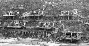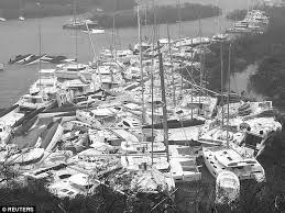 We finally have some news.  We saw this picture this morning of the Nanny Cay storage area.  Most boat are toppled and it looks bad, but Genevieve is identifiable.  She is on her ear, leaning over about 30 degrees and it looks like the mast is still up.  We won’t know the extent of damage … More Now We Know, Kinda