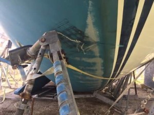 Finally we have some up-close shots of Genevieve and we can see that she is still more or less in one piece!  She is leaning forward and on her side, which means the part of the hull that is on the ground is a forward, strongly built part.  That is good.  Also her rudder–a potentially fragile part of her underside–is up in the air and undamaged.  The mast seems to be straight and in one piece and although there is some damage to her rub rail, toe rail, stations and pushpin, she seems to be water tight and remarkably unscathed by her topple.