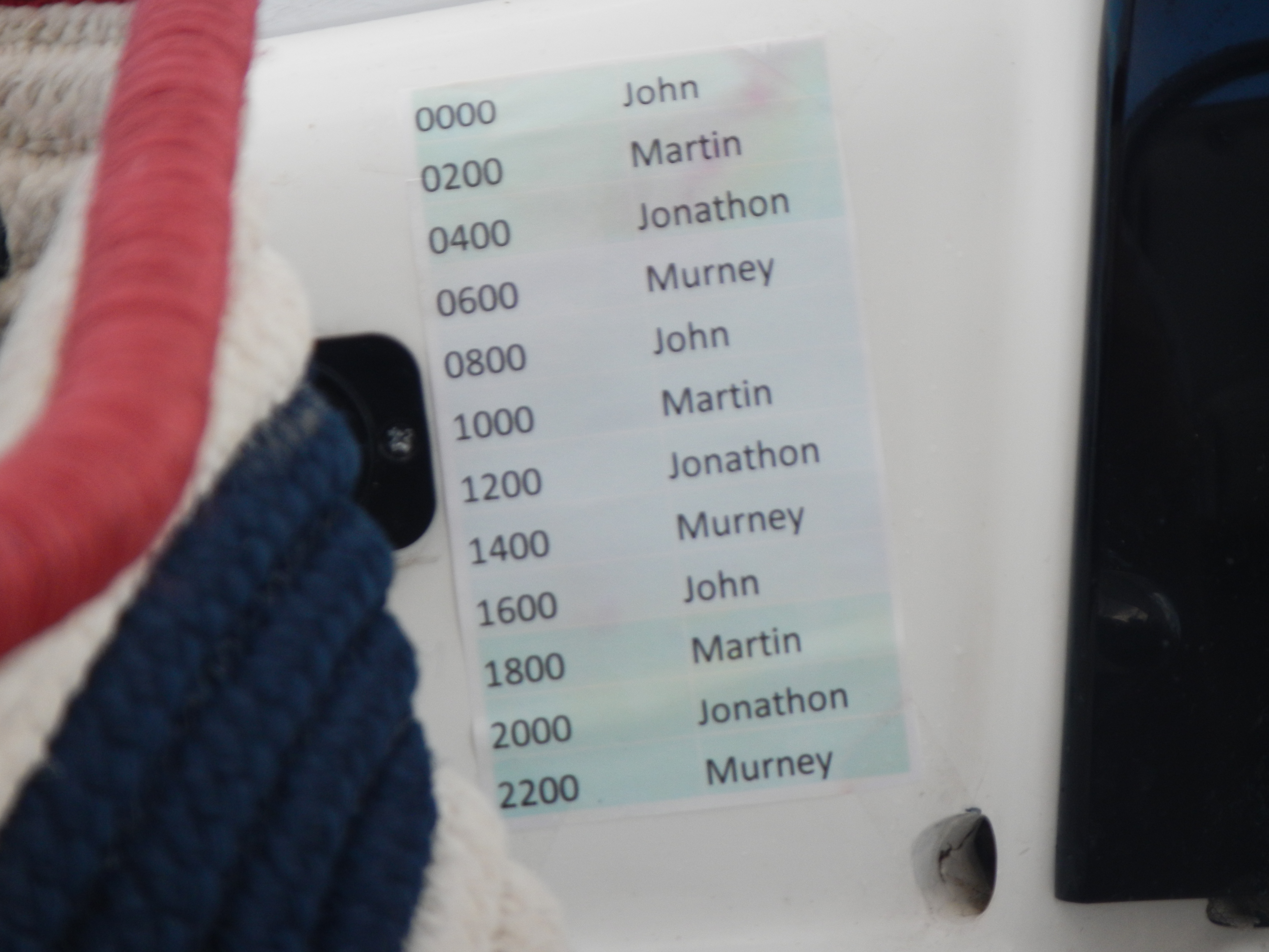 The watch keepers were diligent, searching the AIS, radar and horizon for ships, but frankly we saw pretty much nothing.  A few vessels came within 30 miles of us, but few actual sightings of ANYTHING AT ALL.  No ships, no birds, no sea life (apart from flying fish landing in the boat).  We were so starved for something to see other than sky and ocean that we started to call out flotsam and jetsam and draw pictures of it in the Log Book.  We saw a fishing float, John wanted to stop, pick it up and add it to our collection at West Gilgo.  The Captain vetoed (it was, after all, an ugly color).