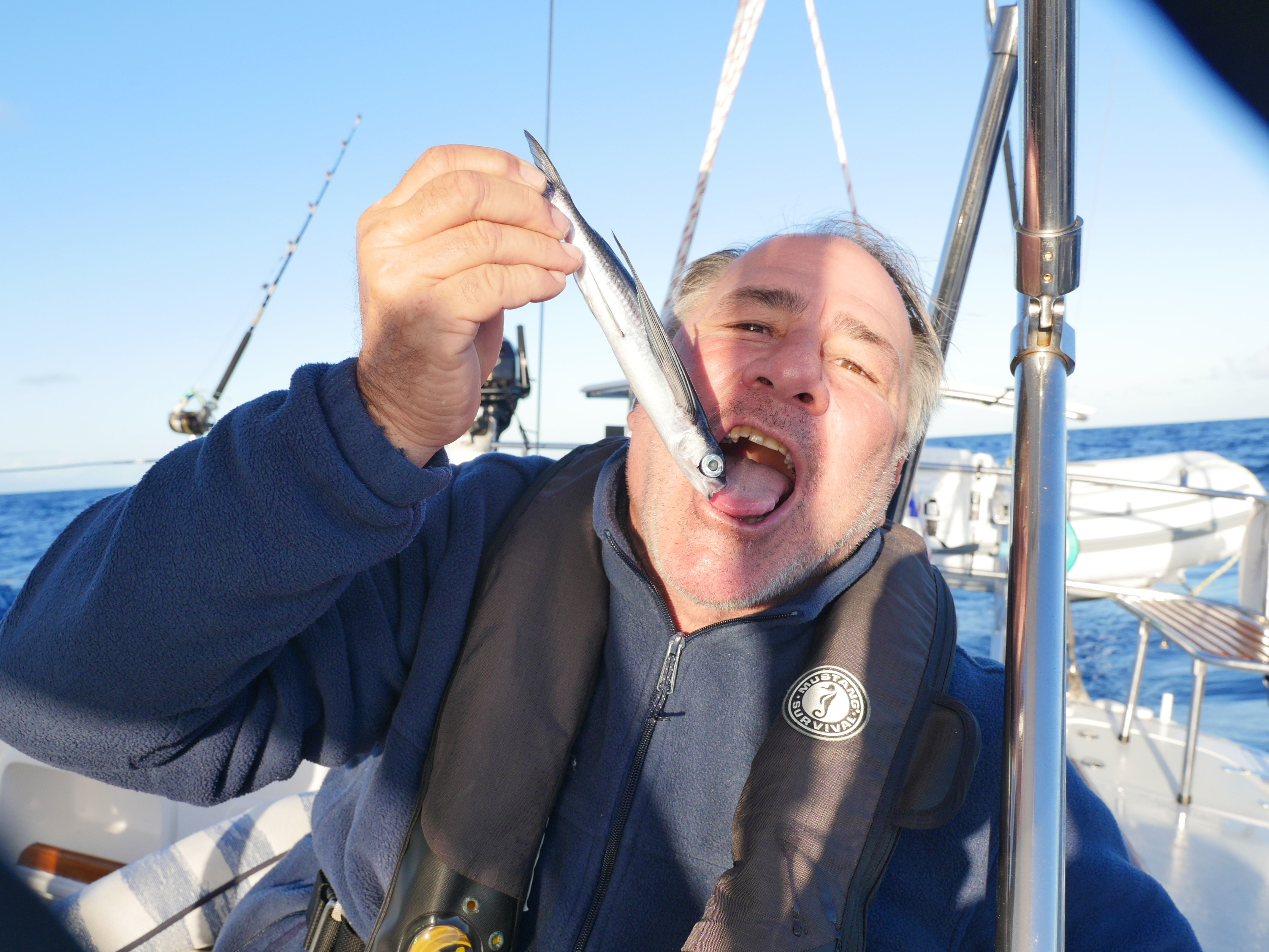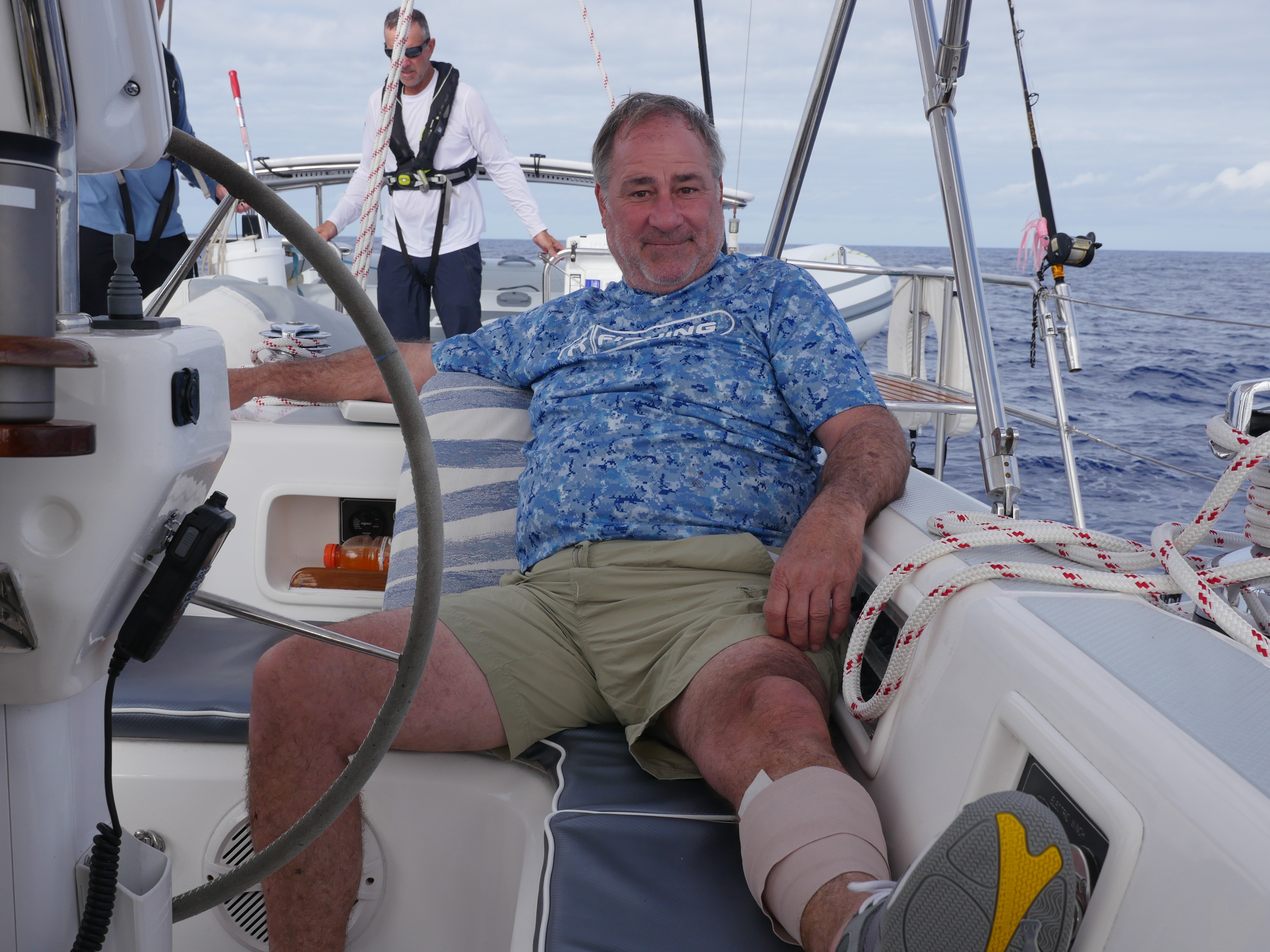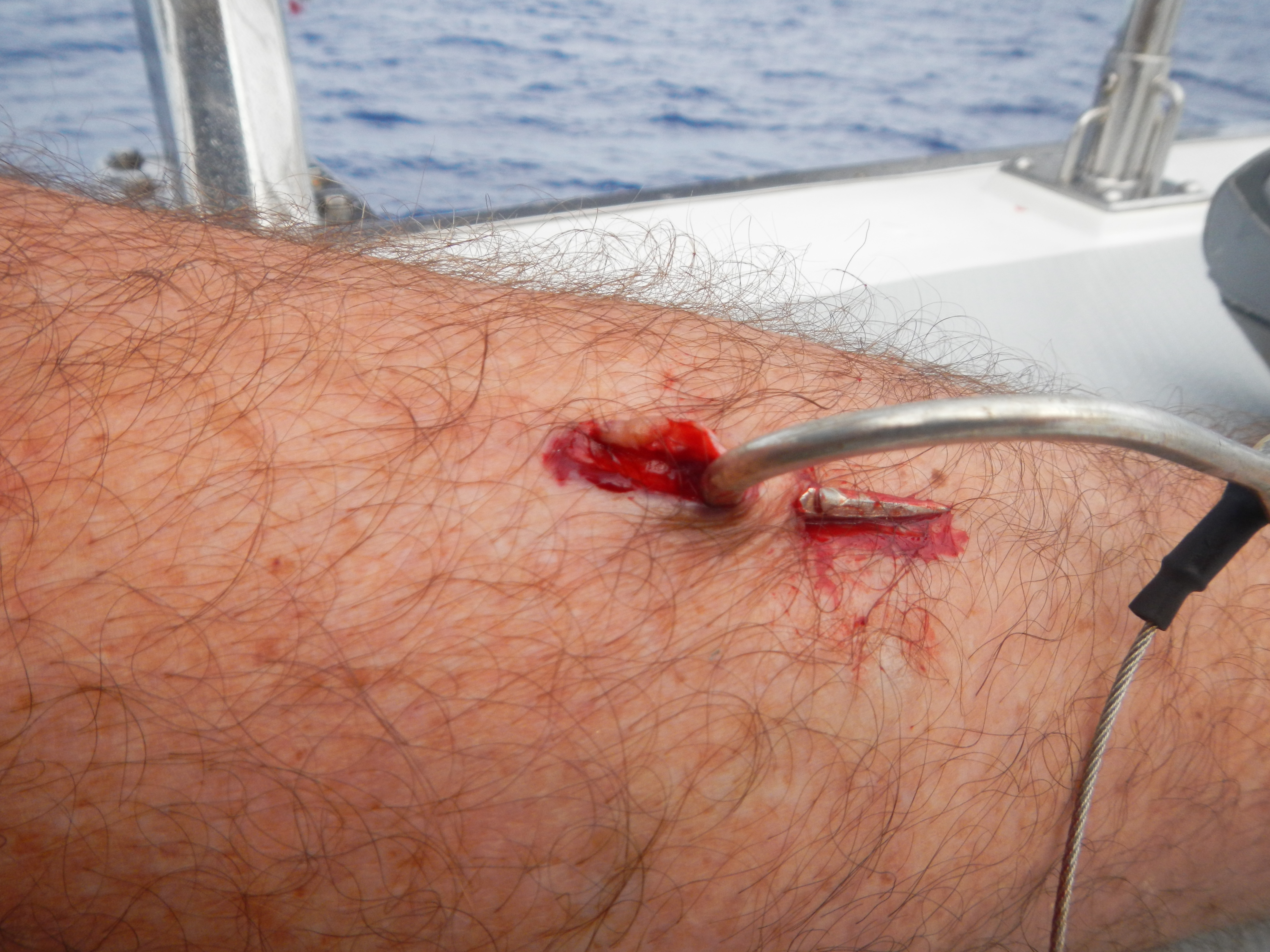 We hooked another much larger Mahi Mahi, which John reeled in.  Murney pulled it over the side and the fish went crazy, flopping around on the deck, spitting the huge hook out of its gills and right into Murney’s leg.  While Murn sat on the big fish Martin grabbed a knife and had to cut Murney’s leg open to get the hook out.  We doused the ragged wound in iodine and antiseptic gel and taped him up with a big, very dramatic bandage.  Murney tried to tell us that he needed rum for the pain and shock, but all he got was seltzer.  We ate the fish with gleeful, malicious relish (and tacos).