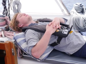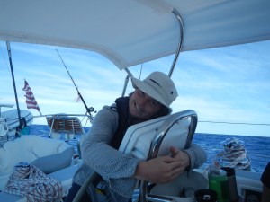 For the first days after we had rounded the Bahamas the wind was not in our favor, forcing us to either motor or sail close-hauled with 25 knots on the nose.  Murney and Jonathon could not sleep in their forward bunks without taking flight, and Martin wanted to stay close to the action, so we took to floors, bean bags and settees in the salon or wedged in the cockpit on the lee side.  The nights were long, no moon to light our way, but some amazing starry nights.