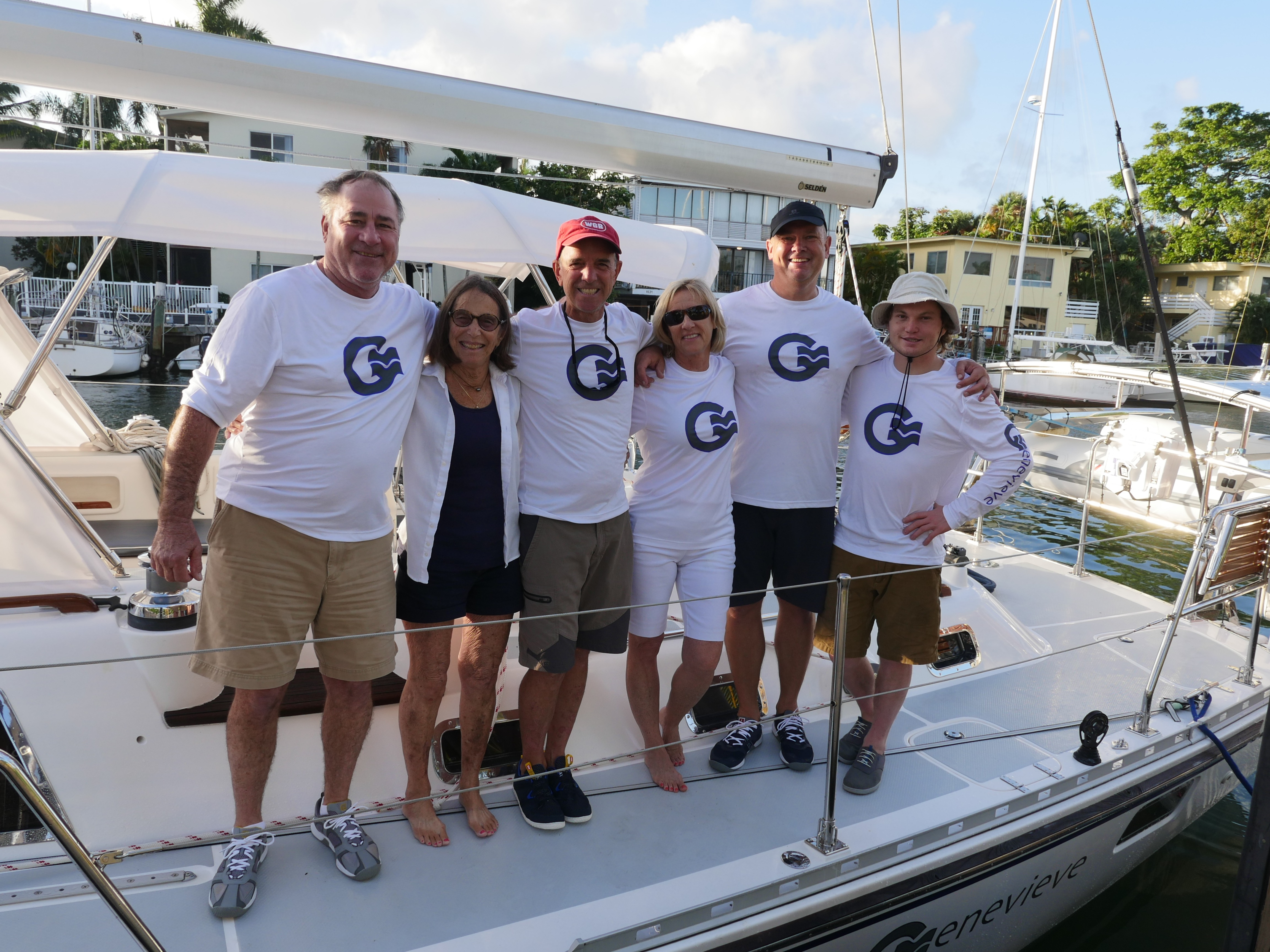 So, on December 31, 2018,  after months of hard work to get her ready, John and Martin gathered a hearty crew (Murney and Jonathon), kissed bye-bye to our surrogate family Larry, Vicki and Pam at the dock of our home away from home in Fort Lauderdale and sailed Genevieve east out into the Atlantic.  The sailing was initially lively with a windy beam reach north over the top of the Bahamas–New Year’s Eve passing without fanfare as we settled into 2 hours-on, 6 hours-off watches.   The crew gradually shook off land living, which Murney did in style by throwing up on John’s new Helly Hansen sailing brogues (bad ice?).  But amazingly, although in the past John has been flattened by Mal de Mer, he ate a hearty first night dinner and was in fine form the whole trip.  He thinks it was the British drugs we got in London and his Wonder Woman pressure point bracelets, but Martin thinks it was more likely to be that he is now a Real Ocean Sailor.