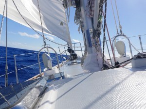 The days marched on, our fuel supply dwindled uncomfortably low as we fought our way east against unfavorable winds and currents at a frustratingly slow speed.  But we ate well, told salty yarns, and enjoyed being disconnected from the world.  After six long days our position and the wind allowed us to turn south and we were greeted by an easterly 20-knot wind and Genevieve shot forward pulling off two 200+ mile days with the speed hovering around 9 to 10 knots on a beam reach.