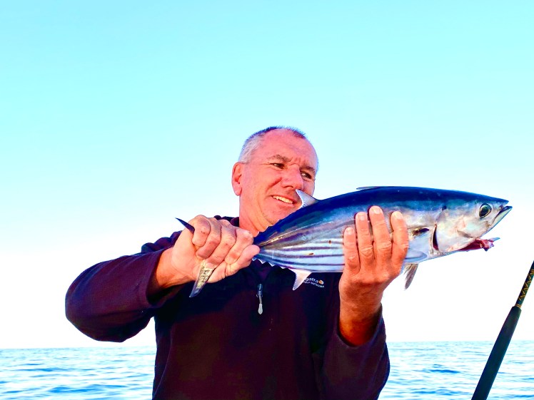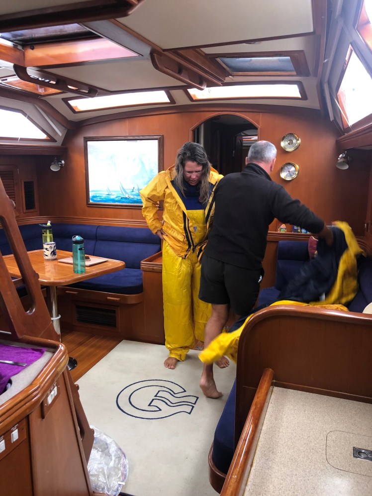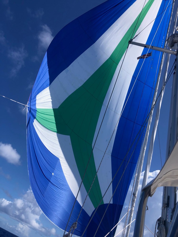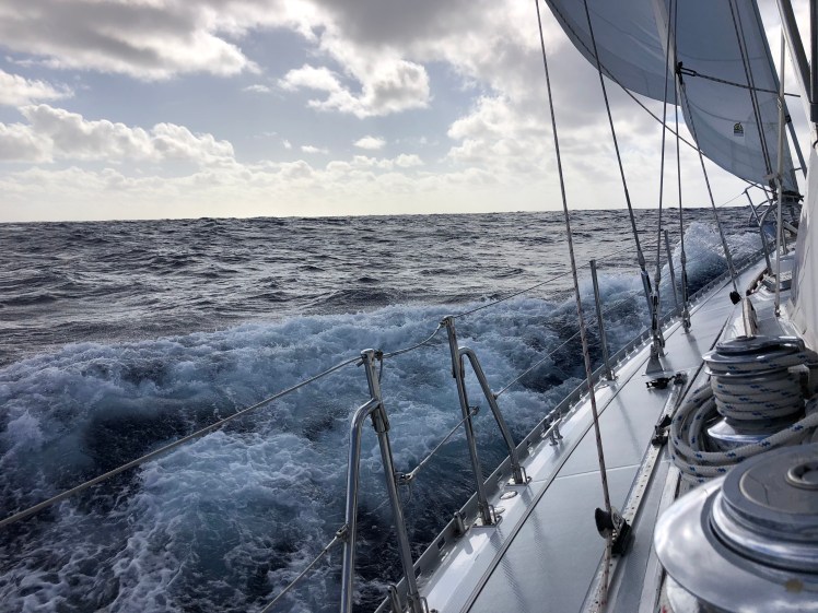 To start, we enjoyed two days of fast, fun, warm reaching. As the sea temperature started to fall, but with shorts still on, the wind veered and we shook out Genevieve’s spinnaker for the first time ever and enjoyed two days of broad reaching.  Stephen complained that John’s fishing rods were faulty as we had only one fish bite in the first four days.  Unfortunately we worked out that it was better to take the protective cork off the barbed hook before you put it in the water.  So that first bite did not supply dinner.