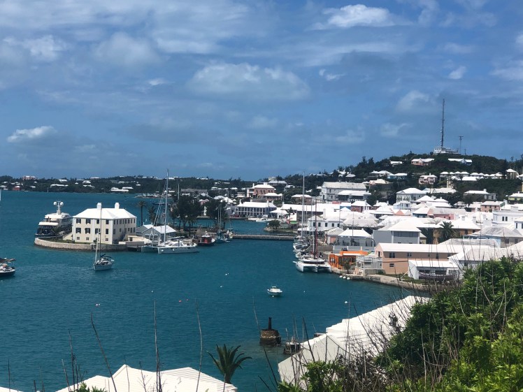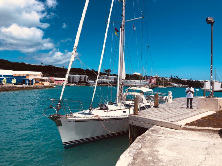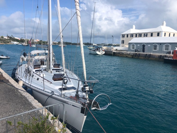 Day five, as we neared Bermuda, the wind died and we ended up motoring into St George’s Harbour, tied up to the (suddenly windy and hard to negotiate!) customs dock and completed our entry process with the nicest and funniest customs officials we had ever met.  But, although friendly, they would not let us go to the pub until our COVID test results were in, so we had to retreat to the anchoring field and bide our time before we could procure $10 pints of Bermudan beer.  Once proven negative (again), we motor-sailed to Hamilton, and tied up in a fancy marina.  However, we decided the quaint (and cheap) town dock at St George’s was more our style, so we headed back there the next day to explore the impossibly lovely east end, replenish, and watch the weather for a window to depart for NYC.