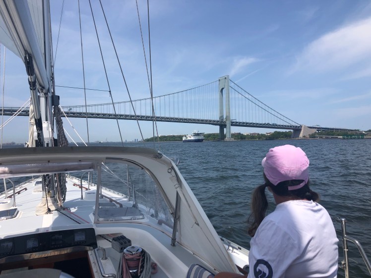On the dawn of the last day, we had an uncomfortable time when the wind decided to blow directly from NYC and we tacked to and fro making little progress, but the wind died away and we ended up motoring on calm-ish seas as the USA came into view followed, painfully slowly, by the hazy outline of the Verrazano Bridge and New York City.  Soon, we were playing our carefully curated collection of NY songs on the speakers and watching New York City unfold in front of us!  Under the bridge, we made a detour to high-five Lady Liberty, ogle at Ellis Island, and then rounded the Battery to make landfall in Brooklyn.  What a way to enter the USA! I wonder if anyone else has ever done it that way before?